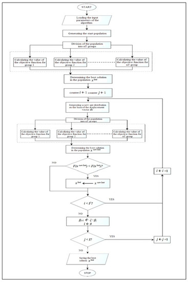 The goal of naturally occurring ants is to efficiently reach the food site, which in the algorithm means finding the minimum of the target function. This mechanism can be described as follows. In general, you should start with determining the algorithm parameters, such as the number of ants M, the number of iterations I, and the vector of the initial jump parameters β1 = [β11, β21, …, βn1], where n is the dimension of the task or the number of variables. The solutions (vectors xk, k = 1, 2, …, M) are ants in the algorithm. Initially, they are placed randomly. In each iteration of the algorithm, the solution with the best characteristics is determined—xbest, which, using a reference to nature, denotes the ant closest to the food. In the next step, the vector of offsets dx = (dx1, dx2, …, dxn) is added to this solution. This vector is created on the basis of the algorithm parameters βji (j = 1, 2, …, n, i = 1, 2, …, I), where dxj є [−βji, βji]. The task of βji parameters is to narrow the area of searching for a solution around the most optimal solution. The initial vector of the parameters β1 at the beginning of the algorithm should be set here. In subsequent iterations, these parameters will be determined from the following dependency βji+1 = ξ · βji, where ξ є [0, 1] and it is the parameter narrowing the search area. There is a relationship here: the smaller the value of the parameter ξ, the more narrowed the search area. This is how new ant distributions are created, which will be updated repeatedly in I2 in each iteration of the process. For each iteration of the algorithm, except the first, the parameter βi is changed. Such action is to simulate the disappearance of the pheromone trace.