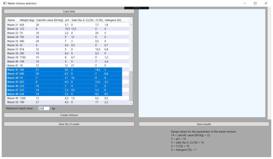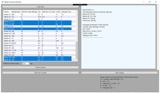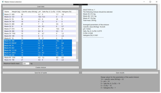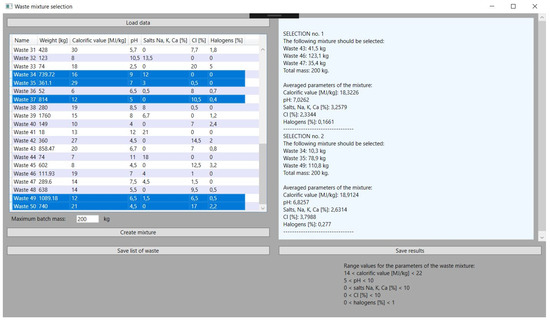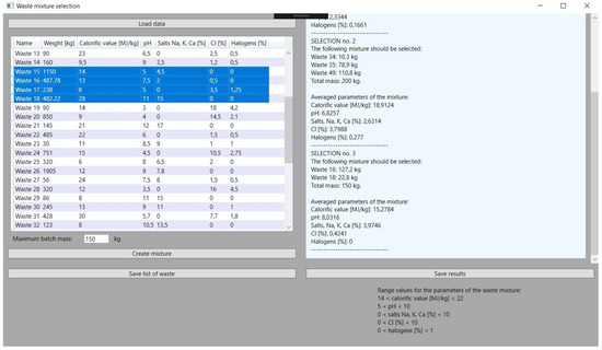 The function of selecting specific waste for the mixture from among all those loaded in the application is an element that makes it flexible. The application user must select the types of waste before obtaining the data about the mixture, but he can do it in many ways depending on the needs. He can choose several types of waste that he wants to convert the most. In hazardous waste incineration plants, there are sometimes situations in which some of the received waste cannot be stored or can, but to a very limited extent, be stored. This is due to the nuisance of these wastes, and hence there is a certain prioritization in directing these wastes to incineration plants. Often, such wastes will require the selection of other wastes with opposite parameters to the batch mixture, hence the solution enabling the selection of several is adequate here. It should be mentioned here that the selection of a certain amount of waste is not tantamount to using each of them in the generated mixture. On the other hand, it is also possible to select considerably more waste until all are selected. This gives the plant operator a lot of room for maneuver. Selected types of waste are marked in blue in the application, as shown in Figure 5.