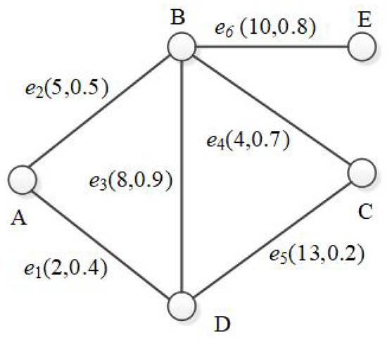 Figure 1 shows an example of an uncertain graph. It models a WSN with five sensors and six communication channels. Sensor node B can connect to node A, D, C and E, costing 5, 8, 13 and 10, respectively. These connections are not stable, and each of them has a probability of existence. For example, vertex B and E cost 10 to be connected () with a probability of , i.e. , which implies that the connection does not work of the time.