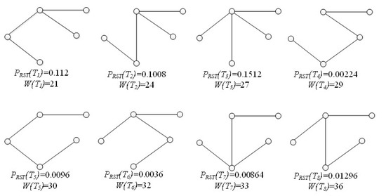 - Rule 2: If , call function GENK to generate the next spanning tree in weight ascending order. If the tree weight is not higher than , then calculate its RST probability and try to insert it into Q.