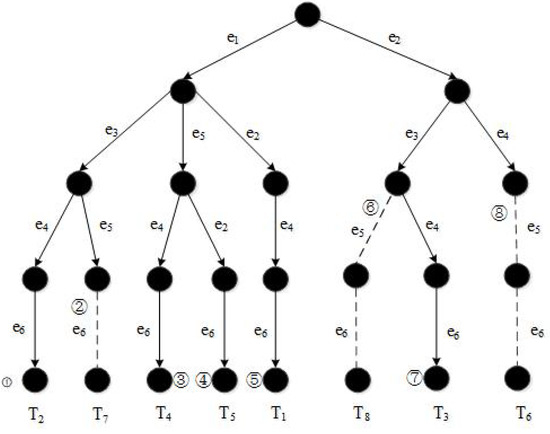 In Figure 4, the solid lines represent the recursive procedures of a depth-first search. The dashed lines are the procedures being pruned. , , , and are generated and regarded as candidates (branch➀➂➃➄➆), while the procedures of generating , and (branches ➁➅➇) stop midway at certain points as pruning rules are applied.