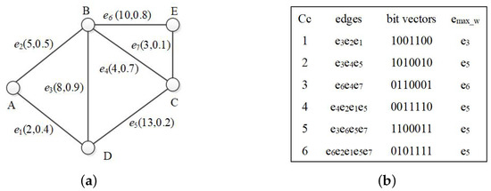 First, we introduce the algorithm for finding the k minimum spanning trees in deterministic graphs [27]. The algorithm is called GENK, and it contains two procedures: EX and GEN. Suppose we have minimum spanning trees and we want to obtain the MST. First, EX finds a pair of edges , where , and are minimums among all possible edge pairs. Then, GEN replaces e with f in order to obtain . is the minimum spanning tree, and it is obtained by using Prim’s algorithm. can be obtained by exchanging edges based on the previously generated trees.