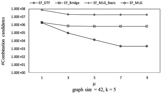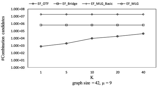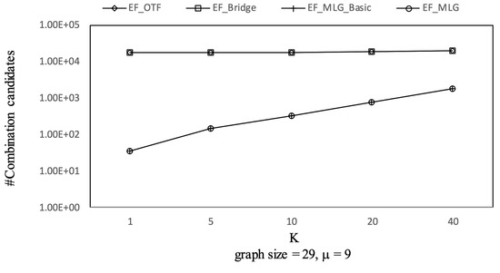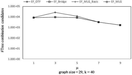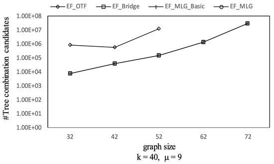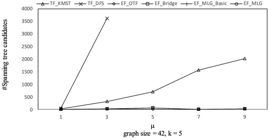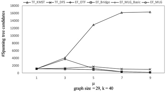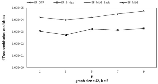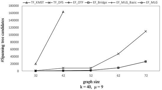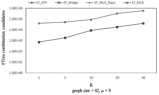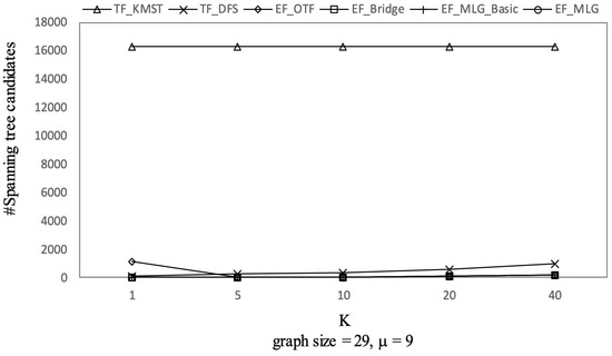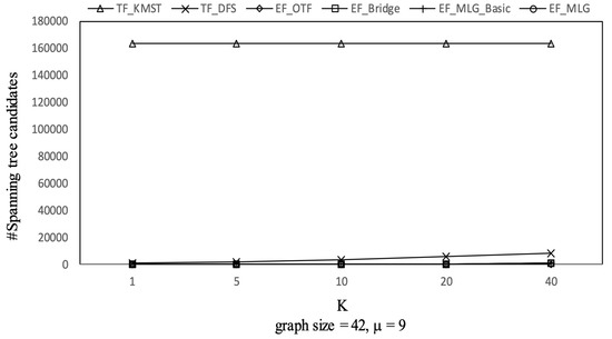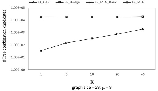The overall trends of tree combination candidates shown in Figure 21 are increasing since there were more qualified tree combinations with a bigger . As long as there are k RSTs, does not affect the spanning tree candidates. Thus, in Figure 22, there are no clear deviations except for TF_KMST and TF_DFS.