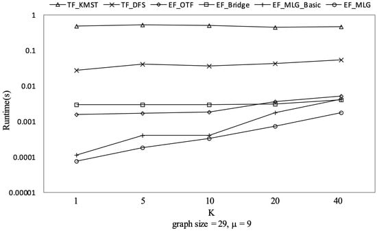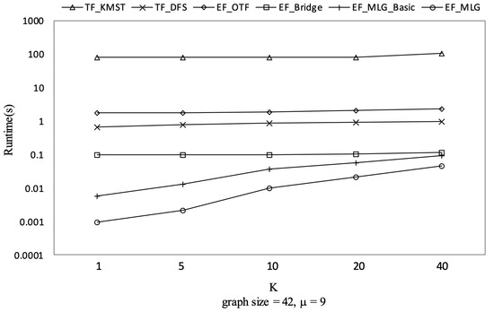 Figure 24, Figure 25, Figure 26 and Figure 27 show the experimental results on Ncfu, in which there was one difference from the synthetic dataset. We can observe that TP_KMST costs slightly more when increased from 7 to 9. The reason is that for a small and sparse graph such as Ncfu, was larger than seven in TF_KMST, which means enumerating almost all the RSTs such that a different makes little difference.