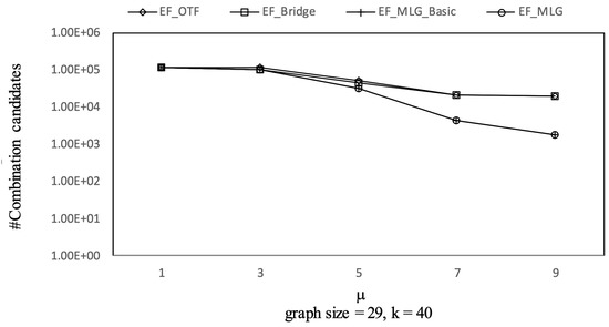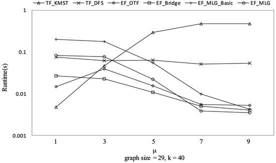 The experimental results on Ncfu are shown in Figure 16, Figure 17, Figure 18 and Figure 19. The overall trends were similar to those from GraphGen. We noticed that there was no bridge in Ncfu; thus, the bridge-based pruning did not work in the edge filtering algorithms. Algorithm EF_MLG was the best algorithm, while its superiority relative to EF_MLG_Basic weakened. The reason is that, as a sparse graph, the ratio of cycles of Ncfu was lower than that of GraphGen. There are also many in-line curves, and the reasons are the same to that of experiments on GraphGen.