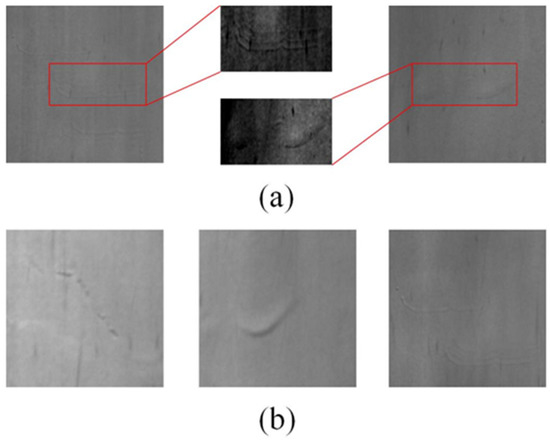 In the field of steel defect detection, nearly all the public datasets were processed by aforehand detection, selection, and segmentation based on prior knowledge. The samples of these datasets could not reflect the most real situation in the actual industrial production line, which has a certain impact on the performance stability of the algorithm after being transplanted to the production line. Faced with the above bottlenecks, we collected and produced a hot-rolled steel strip surface defect database called CSU_STEEL to imitate the industrial production line situation perfectly for the first time. CSU_STEEL contained 968 original images of hot-rolled steel strip surface on the industrial production line, with a size of 1024 × 4096 pixels. Figure 5 shows samples of CSU_STEEL.