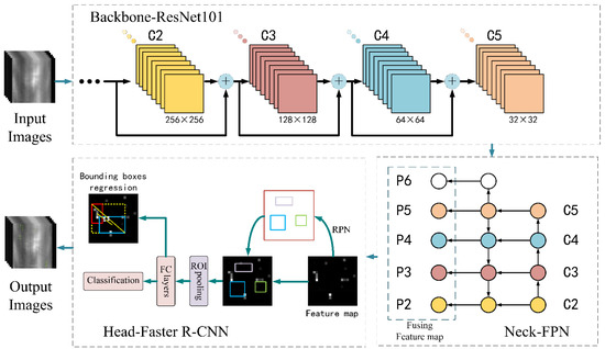 Structure of smoothing complete feature pyramid networks (SCFPN). Backbone: ResNet101, Neck: FPN, Head: Faster R-CNN, Bounding boxes regression: CIoU loss, Classification: Cross-entropy loss with label smoothing.