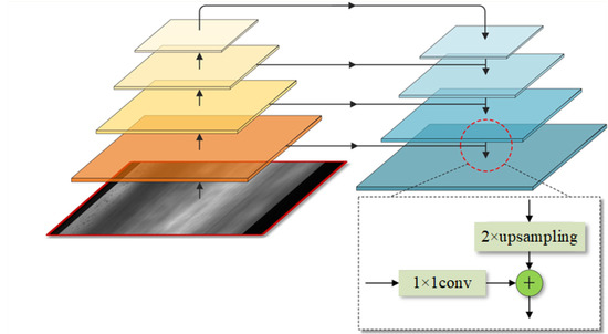 The top-down pathway upsamples (2 × upsampling) feature maps which are robust in semantic information, but with lower resolution to produce finer resolution features. In order to acquire features with robustness, lateral aggregations are used to fuse feature levels of the same size spatially from the bottom-up pathway pyramid and top-down pathway pyramid. The features in the bottom-up pathway are poor in semantic information expression, but their information of location is more accurate because they were produced by input images originally. Figure 3 shows the structure of feature pyramid. The way of lateral aggregations is a pixel-level addition. A new feature pyramid is set up after repeating the above operation, which has same structure of the previous pyramid but is robust semantically. As shown in Figure 2, the convolutional level C6 is construct by simply 1 × 1 conv from C5, which has the stronger sematic information and minimum resolution. Then, the final feature maps are generated by 3 × 3 convolution on each merged map. we name these merged feature maps as {P2, P3, P4, P5, P6}} which possess same resolution as {C2, C3, C4, C5, C6} severally.