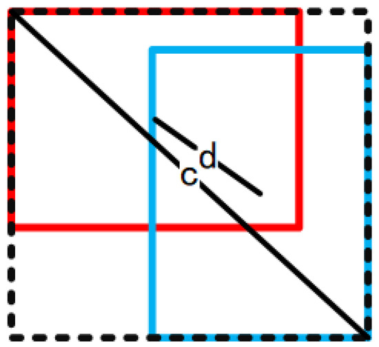 Figure of complete IoU. Red: ground-truth box, Blue: predicted box, d: the Euclidean distance, c: the minimum bounding rectangle diagonal length of predicted boxes and ground-truth boxes.