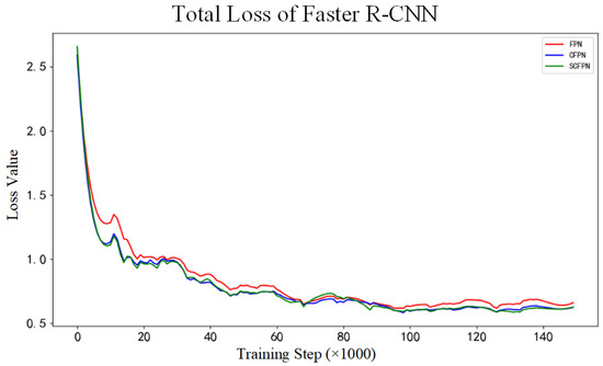 Figure 6 shows the curves of the Faster R-CNN total loss values of each model during the training. In comparison with FPN, CFPN, and SCFPN have showed greater regression gradients in the early stage of training, and Faster R-CNN total loss of CFPN and SCFPN stabilize at 0.65 around 100,000 steps. In contrast, the Faster R-CNN total loss value of FPN still fluctuate around 0.7 after 150,000 steps. The curves of total RPN loss value of each model during the training are displayed in Figure 7. Similarly, the models of CFPN and SCFPN have greater regression gradients than FPN in the early stage of training, and smaller RPN total loss values also occur. The RPN total loss values of the three models all become stable around 0.05 at about 87,000 steps.