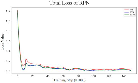 Total loss of RPN. Red: FPN; blue: CFPN; green: SCFPN.