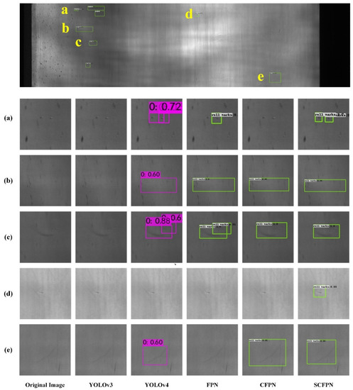 As can be seen from Figure 8, the roll marks can appear on any local location of the steel surface, with irregular appearance and large-scale variation, and low contrast compared to the background. For the quality control of steel strip industry, roll mark has the first alarm level, which brings great challenges to the industrial online inspection. Figure 8 shows the defect slices of the original image and the detection results of YOLOv3, YOLOv4, FPN, CFPN, and SCFPN from left to right, respectively. For type (a) roll marks, they occupy a very small area relative to the whole steel strip image and manifest in the shape of tiny round beads which are difficult to distinguish by the naked eyes in the industrial site, and usually easily submerged by tiny raindrops and rain lines in the background. Because of these characteristics, both YOLOv3 and CFPN lose their perception of such defects, FPN only detects part of these defects, our SCFPN and YOLOv4 still completely detect them. Type (b) roll marks are typical and common roll marks in the form of long and narrow trail. YOLOv3 is not sensitive to such defects, by contrast, the three methods of YOLOv4, FPN, CFPN, and SCFPN have robust cognitive ability to such defects. Type (c) roll marks are irregular roll marks with discontinuous shape, which can be detected by all other methods except YOLOv3, but FPN and YOLOv4 identifies it as two roll marks. It can also be seen from the figure that SCFPN is more accurate in identifying the location of type (c) defects. Another common roll marks are type (d) defects, which are characterized by small area proportion, tiny line shape, which are easy to be buried in noise. Only SCFPN shows excellent identification performance. Type (e) roll marks are also a common roll mark, which occupy a relatively larger area than other defects. Besides, the texture of type (e) manifests blurry, and the orientation usually inclined downward. According to the detection results, only YOLOv4, CFPN, and SCFPN can detect it.