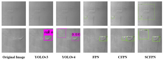 For the comparison of detection results of rare roll marks with special morphology, as shown in Figure 9, from left to right are the original image, as well as the detection results of YOLOv3, YOLOv4, FPN, CFPN, and SCFPN. The two mentioned roll marks exhibited in the original image are rare roll marks that appear less frequently in the training dataset. For the first type of roll marks, it presents elliptic convex shape, we can observe that YOLOv3 and YOLOv4 have lost its perception ability, FPN only detects typical roll marks that occur frequently, and only part of them are detected by CFPN. In contrast, our SCFPN not only detects part of common roll marks, but also has the ability to identify rare defect forms. The second kind of roll marks are in the form of bending a broken thin line, only SCFPN and YOLOv4 can detect it with high confidence, while the other methods only detect the common roll marks and lose the identification of such defects.