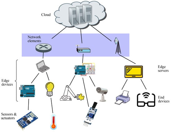 Furthermore, edge computing takes advantage of the addition of machine learning (ML) algorithms associated with AI, leading to the concept of Edge AI, which may be seen as the application of AI to run ML tasks on edge devices in order to enhance performance [5]. It is to be noted that an edge device may be either an edge server or an end device, whereas sensors just gather data and forward them on to end devices, whilst network elements connect edge devices to cloud facilities, as shown in Figure 1.