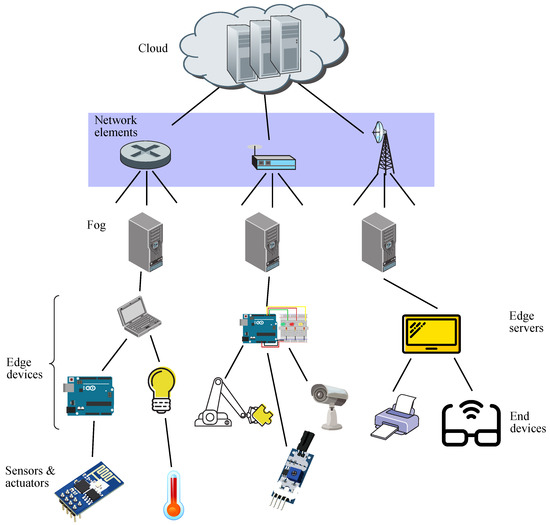 The aforementioned figure shows a network connection layer which only routes traffic flows from the edge servers (brokers) up to the cloud and the other way around, thus not taking part in remote computing. Hence, the processing entity above an edge server is the cloud, which in fact, acts as the only hierarchical entity for edge servers when dealing with offloading or backup processing and storage. Otherwise, in a fog environment, the fog nodes may be located between the edge of the network and the cloud, and in such a case, edge servers will be connected to fog servers, those being the next and higher processing level, which in turn, will be connected to cloud servers, these being the last and highest processing level, staying on top of the hierarchy [141].