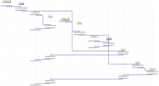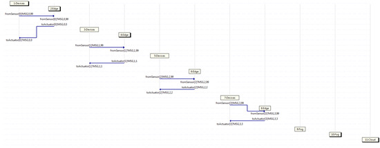 Taking this all into account, two scenarios are modeled, where the first one is related to an edge environment and the second one is associated with a fog environment. Both have sensors and actuators external to the model, and a channel directly connected to it, specifically to the end devices, which in turn, have channels to interconnect them to the edge servers. However, in the edge domain, the edge servers connect straight to the cloud servers, whereas in the fog domain, the edge servers link to the fog servers, and those do to the cloud servers.