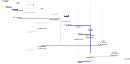 Therefore, two different type of models are studied herein, using ACP. Two case scenarios are shown—an edge computing one, where three levels are taken into consideration (end devices, edge servers, and cloud); and a fog computing one, where a fog level is summed up. Regarding ACP [144], the models proposed will be exhibited by means of algebraic expressions to portray the behavior of the concurrent communicating processes involved, containing the specifications and verifications, whilst respecting Spin [145], the models presented will be exposed by means of Promela code [146], including the verification by means of the Spin model checker, along with some message sequence charts (MSCs) describing the message exchanges performed by communicating concurrent processes involved in a visual way.