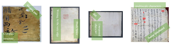 Text detection is a crucial assumption of an active role in the process of text understanding. In terms of Chinese characters in old documents, more challenges arise due to many difficulties such as complexity in the structure of each character, some missing parts, dense distributed characters in the image, writing at the very edge, significant multi-scale characters, and dirt that yields a background texture noise, as shown in Figure 1.