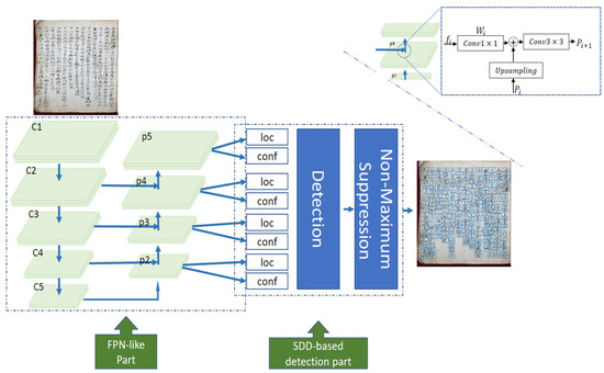 The architecture of the proposed FAN-MCCD: the FPN-like part, which is a multi-scale feature using fully convolutional network (FCN) with channels of halved-value for the purpose of obtaining characters at different sizes; the SSD-based part, which depends on pre-selected boxes using focal loss for more accurate classification during detection and to suppress the background noise problem in old documents; and the NMS for pruning these bounding boxes. The upper right corner explains the merging process using element wise addition.