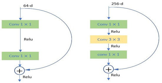 The function F of deep residual operation. Left: the block design for ResNet34. Right: the bottleneck block design for ResNet52 (thinner block).