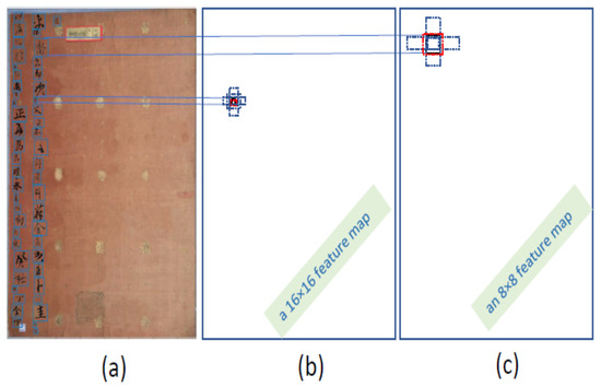 The process of multi-scale character detection: (a) image with ground truth boxes; (b) a 16 × 16 feature map with higher resolution detects a smaller character (red bounding box); (c) an 8 × 8 feature map with lower resolution detects a larger character (red bounding box). Over each feature map, there are a number of default boxes (dotted ones) at the given position, and the red box means that it is the proper one for character size.