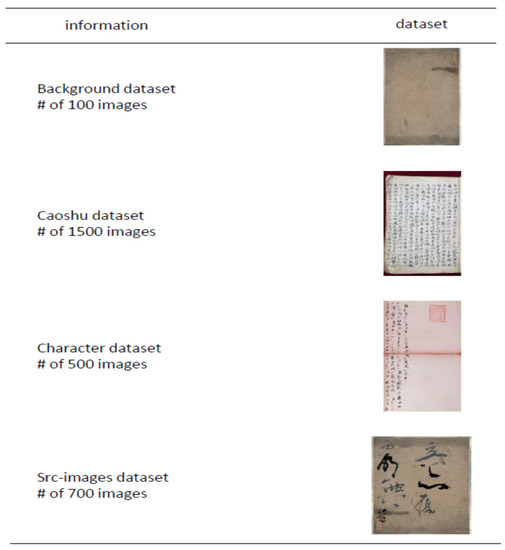 We evaluate our proposed FAN-MCCD on three kinds of old document datasets and on background-only images. These data were collected by Kyungpook National University KNU (available on: http://dila.co.kr/index.php, accessed on 25 October 2021), and they were scanned or photographed documents of separately handwritten characters in the Chinese language.