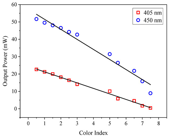 Figure 3 shows the output power at wavelengths of 405 and 450 nm when oil samples with different color indices were measured using the 10-mm pathlength cuvette. Based on the collected data, the output power decreases as the color index of the oil sample increases. The reduction of the output power, either at 405 or 450 nm, was due to the optical absorption by the oil sample. The steeper decreasing slope for the measurement at 405 nm indicates that the measurement of the color index at this wavelength is more sensitive, compared to the measurement at 450 nm. For the measurement at 405 nm (450 nm), the output power saturated to almost zero for CI ≥ 2 (CI ≥ 3.5).
