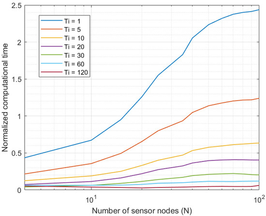 Figure 3 shows the results of the first experiment. As can be seen, for all Industry 4.0 systems up to 10 sensor nodes, the proposed solution was able to curate all data series in real time, as the computational time was below the sampling period. However, systems with higher sample-generation rates ( s and s) got congested when the number of nodes went up. Specifically, systems with 20 and 40 elements, respectively, caused the system to become unavailable. Any other higher sampling period did not cause congestion in the system, even with platforms including up to 100 sensor nodes.