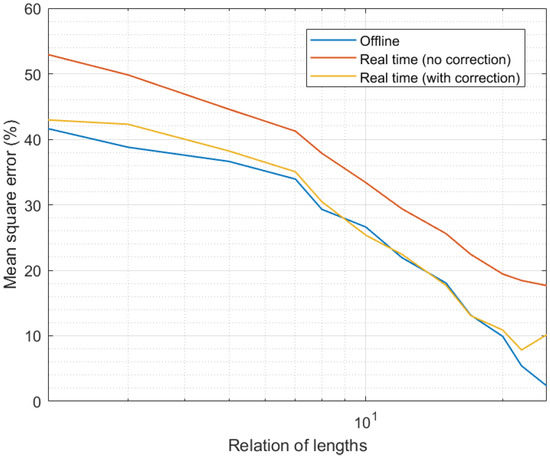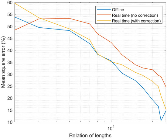 Finally, Figure 7 shows the results of the fourth experiment. As can be seen, the evolution of the MSE with the relative interval length was similar to the one observed in Figure 4 (third experiment). As larger intervals were considered and more samples introduced in the candidate calculation process, the precision went up and the MSE went down. However, in this case, the precision was slightly lower than in the simulation study; in particular, we can see the MSE was around 5% higher. In any case, the qualitative evolution of the proposed mechanism was equivalent in simulation and real scenarios. Only in one situation was the performance different in a relevant manner: for curation and expanded time intervals with the same length (relation of lengths equal to the unit). Under those circumstances, in simulation scenarios, the correction phase had a smooth behavior and it still reduced the MSE. However, in real scenarios, when the relation of lengths was equal to the unit, not enough information was provided to the correction algorithm and thresholds did not converge properly. As a consequence, the correction phase introduced an additional error instead of improving the data quality. This situation, in any case, was very transitory and solved immediately when the expanded interval was even slightly higher than the curation interval (relation of lengths above the unit). Despite this fact, and once more, the impact of the correction phase was relevant, even more in this real hardware implementation (MSE may grow up to around 90% without the correction phase).