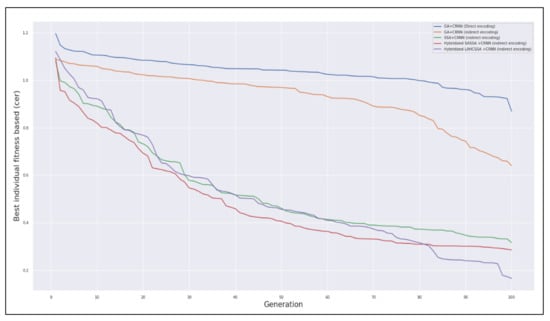 This section discusses the convergence behavior of the hybrid SSA when it is used to optimize the CRNN. In terms of convergence, we present the results of implementing neuroevolution using the genetic algorithm as an optimization method. We implemented the genetic algorithm for comparison purposes due to the lack of works that implemented the evolution-based CRNN for the sequence modeling task of handwriting recognition. In this implementation, we examined two encoding schemes: direct and indirect encoding. We included both to measure their impact on the genetic algorithm when it is used to optimize the CRNN. The second experiment shows the effectiveness of the proposed SSA with respect to the encoding schemes. Additionally, the results of the hybridized SSA with LAHC and SA are presented with respect to these encoding schemes (see Appendix A). The fitness of each individual is displayed to show the proposed algorithm’s convergence (see Figure 3).