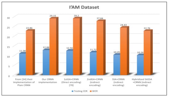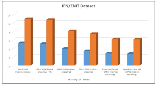 Most recent studies focused on evolving convolutional neural networks (CNN) and tested them using a simple classification problem for sequence-less datasets, such as recognition of individual handwritten digits or characters. Refs. [52,56,57]. The main deferent in our work is that we tackle more challenging issues including sequence learning to recognize handwritten words or sentences. This problem needs to utilize evolving adapted deep learning algorithms which combine the benefits of the capabilities of convolutional neural networks (CNN) algorithms along with the capabilities of recurrent neural networks (RNN). The adapted deep learning algorithm (CRNN) that we evolved using the optimizing technique applied on the sequential text in various languages (Arabic and English). Additionally, in the aforementioned studies, evolving of RNN units was utilized separately without the use of any convolutional neural network. In addition, most studies used the PSO and ACO algorithms rather than investigating new swarm intelligence techniques. Additionally, previous works that studied CNN optimization did not address their imbalanced search.