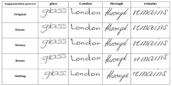 An Arabic dataset, called the Institute of Communications Technology/Ecole Nationale d’Ingénieurs de Tunis (IFN/ENIT) dataset [69,70], was used in this research to demonstrate the impact of using different languages on our model’s performance. IFN/ENIT contains 32,492 handwritten word images, and each word presents a name of a Tunisian city or village. The dataset includes contributions from over four hundred writers so that it includes several varieties of writing styles. The dataset was separated into five sets: A, B, C, D, and E. The first four sets were adopted for training, while set E was used for testing. The training sets include a total of 26,459 images, with 6033 images for testing.