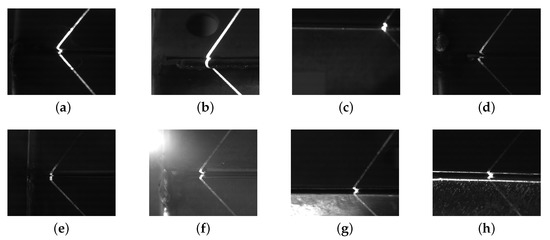 Variation of valid images of the weld seam location captured by the welding robot: (a) Expected configuration, (b) bent edge, (c) blurred location, (d) large gap, (e) small intersection, (f) overexposed image, (g) unexpected reflection and (h) line noise. Our dataset also contains invalid images which do not show the location for the weld seam to be placed at all.