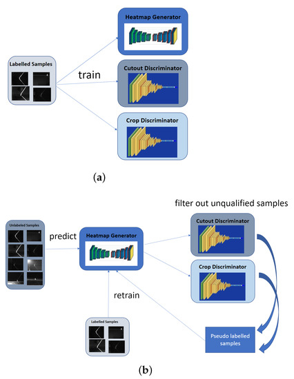 We propose a two-phase framework for learning from unlabeled samples. In the first phase, we train our networks by a limited number of labelled samples which is shown in Figure 3a. In the second phase, we retrain the heatmap generator with pseudo labelled samples which are obtained by filtering out unqualified predictions as shown in Figure 3b. Our semi-supervised algorithm aims to progressively improve the performance of the heatmap generator. A key advantage of our algorithm is that three networks (generator and two discriminators) can share the same labeled data to train in Phase 1 since they are independent networks, and each network has a unique structure and goal. Moreover, during the process of training the two discriminators, we can generate additional training samples by random cutout and cropping from the original labeled images. This training strategy on discriminators reduces the required minimum number of labeled samples. The algorithm is detailed in Algorithm 1 where indicates a labeled image and indicates an unlabeled image. The training algorithms uses labeled images and unlabeled images. The influence of the hyper-parameters , are illustrated in Figure 7.