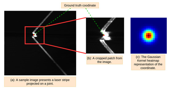 (a) A sample image of a joint with laser stripe projection. (b) A zoom-in area from the sample image. (c) The Gaussian heatmap representation of the ground truth coordinate.