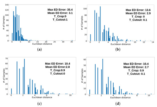 We adapt the feature extraction layers of VGG-16 [19] and append two fully connected layers for each of our two discriminators. Each discriminator network outputs a single confidence score for the input image, which is either a cropped area from the original image, or an image with a cutout area replaced by some random grayscale value. Figure 6 shows examples of modified images as input to the cutout and crop discriminator, respectively. Both discriminators examine the quality of the prediction from the heatmap generator. Figure 7a depicts the Euclidean distance distributions of 927 predictions from the generator. Most of the predictions have an error range from 0 to 5 pixels, but some outliers have an error larger than 10 and in particular, the maximum Euclidean error distance is around 35 pixels. Those outliers may drastically reduce the accuracy of the generator if they would be used as pseudo labels for the next training step. Figure 7b shows that we can apply the cutout discriminator to filter out some outliers. As the result, both the maximum Euclidean error and mean Euclidean error can be reduced. On the other hand, the error also can be reduced if we only use the crop discriminator to filter out outliers (Figure 7c). Figure 7d shows utilizing both, cutout and crop discriminators to detect and filter out outliers. Consequently, we can reduce the maximum Euclidean error and the mean Euclidean error to . Figure 7 shows that when we tighten the thresholds on the respective confidence scores and , an increasing number of outliers can be eliminated. The details of each discriminator are explained below.