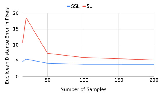We conduct experiments with different number of samples selected randomly from all labeled data and report test results on the 927 testing samples. The test samples are strictly used for testing and our methods uses only the training data for fitting. The details of the experimental results are shown in Table 2. In the first group of data, we randomly select 200 labeled samples and separate them by ratio of 9:1 for training and validation, respectively. The MED error is 5.278 pixel after supervised learning. By applying our semi-supervised process three times consecutively, the MED error can be reduced to 4.328, 3.968 and 3.885, respectively. We then reduce the number of labelled data to 100, 50 and 20, respectively, while keeping the same ratio for training and validation. As expected the error in the supervised step increases with the reduction in the number of labelled samples, however, the semi-supervised steps are able to reduce the error even with just 20 labeled images for training and validation. After three semi-supervised training steps, the error is reduced from a MED of 18.598 to 5.56 which is not quite as low as when using 200 labelled samples but it is still well below the Stacked Hourglass and HRNet methods (cf. with Table 1). Figure 8 summarizes the performance of our SSL approach demonstrating a consistent benefit in terms of error over supervised training independent of number of labelled samples. As to be expected, the benefit of semi-supervised training is largest when the number of labelled samples is small.