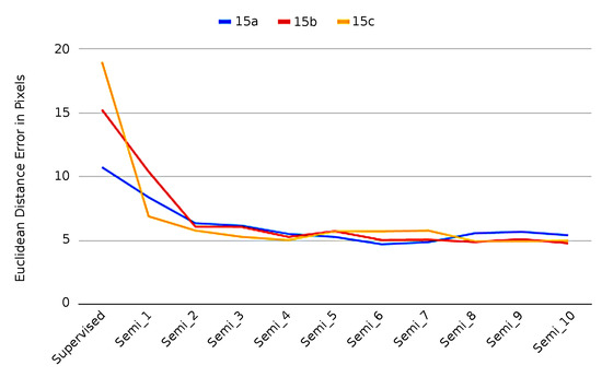 The Figure 9 and Table 3 shows that the performance of the heatmap generator can be significantly improved by utilizing the semi-supervised technique. After several semi-supervised iteration, the error drops from supervised learning stage dramatically and constantly. The accuracy of a heatmap generator trained by 15 random labeled samples followed by semi-supervised steps is very close to a generator trained by 7415 labeled samples.