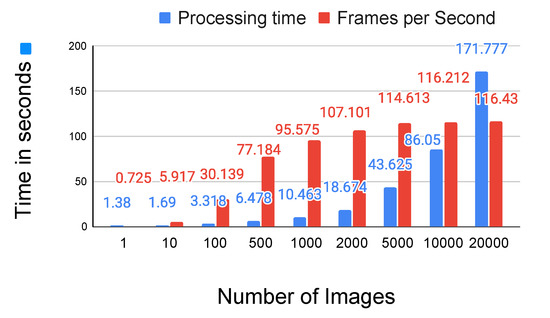 The average runtime of the heatmap generator during prediction. The blue bars are the processing time in seconds and the red bars are the frames per second (FPS) for a particular number of sample images in a batch. The shown result is the average over 10 runs for each batch.