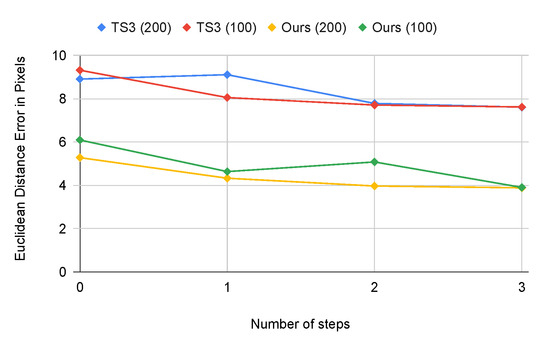 We compare our method with TS3 [32] on our dataset with 200 and 100 labeled images, respectively. We run each model by three semi-supervised iterations. The x-axis indicates the results of four models. The y-axis indicates the Euclidean Distance error.