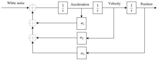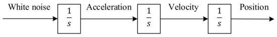 In these models, the control input of the system is considered white noise. Here, we have focused on the Wiener process acceleration model. It assumes that the acceleration is a Wiener process or a process with independent increments, which is not necessarily a Wiener process. In other words, this model supposes that jerk is an independent process (white noise). It is also known as the nearly-constant-acceleration model [6]. The block diagram of the Wiener process acceleration model is presented in Figure 1. In this model, the transition matrix () and the process noise covariance matrix (), which is introduced in Section 2.1, for , are as follows: