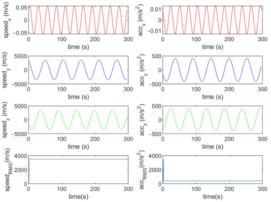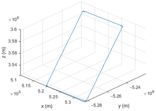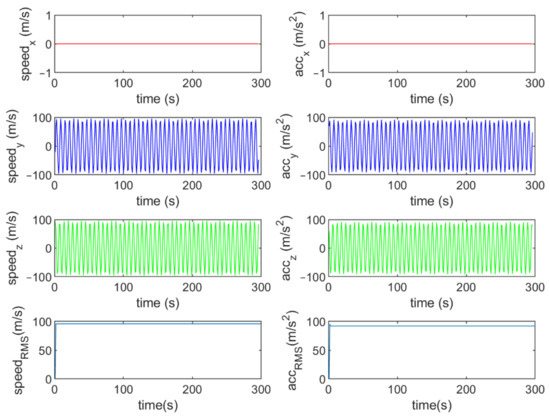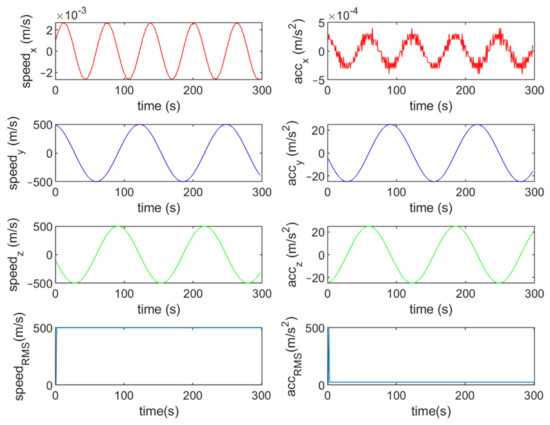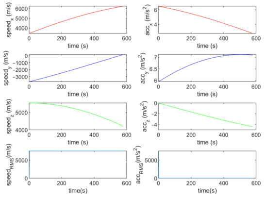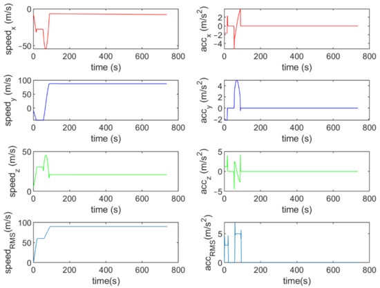 Six different movement scenarios are used to evaluate the performance of the methods. Test scenarios involve the movement of an airplane with a GNSS receiver inside. The first scenario concerns the movement of an aircraft at a speed of 90 m/s. The second to fourth scenarios are related to moving in a circular path at 100 m/s, 500 m/s, and 3500 m/s. The fifth scenario is moving with a speed of 3200 m/s in a rectangular path. The last scenario is moving at a speed of about 7200 m/s in space. The trajectories of the scenarios and their speeds and accelerations are shown in Figure 4, Figure 5, Figure 6, Figure 7, Figure 8, Figure 9, Figure 10, Figure 11, Figure 12, Figure 13, Figure 14 and Figure 15.