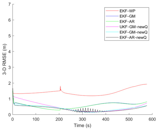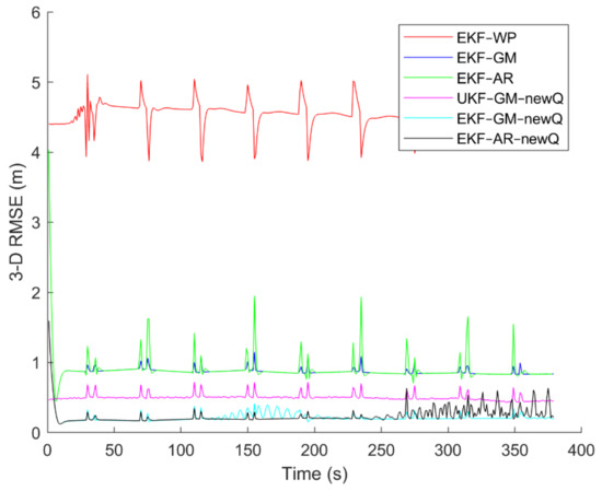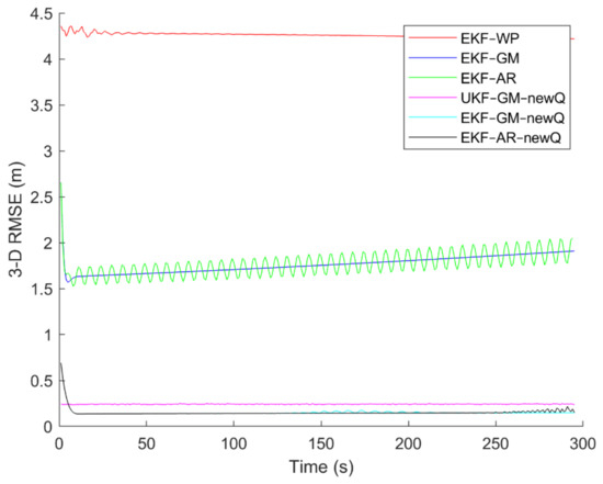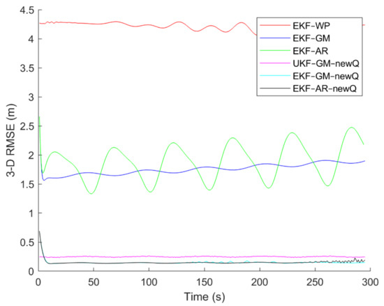 To evaluate the performance of the methods, positioning was performed, using the EKF and UKF algorithms along with the Wiener process (WP), Gauss–Markov (GM), and AR models, and with diagonal VCM (diagonal Q) and the proposed VCM (new Q). The positioning results are shown in Figure 16, Figure 17, Figure 18, Figure 19, Figure 20 and Figure 21. In addition, the 3D root mean square errors (RMSE) of the positioning methods are presented in Table 1. The parameters used in the AR model are , and . Based on these values of parameters, the transition matrix is as shown in Equation (37). We also selected , , and for the scaled UKF algorithm.