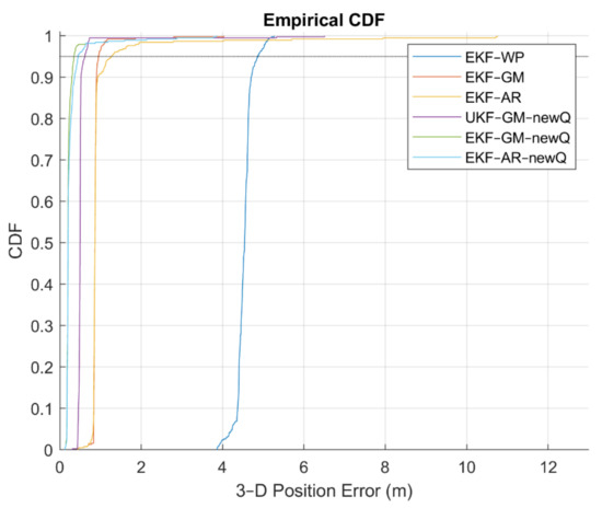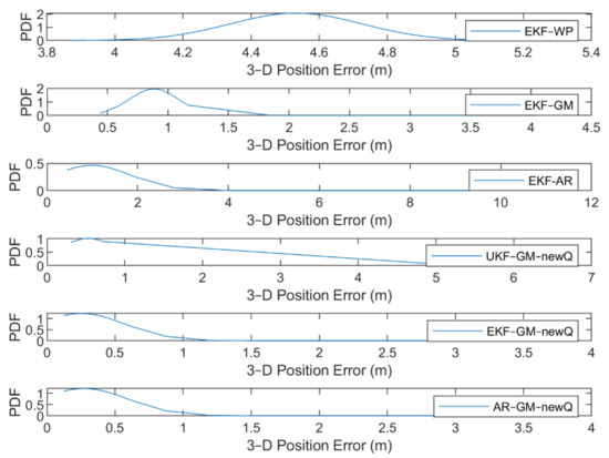 Figure 23 shows that the maximum PDF in the EKF algorithm with GM and AR models occurred at a position error of 25 cm and the errors start from a value of about 12 cm. In the EKF-WP, EKF-GM, EKF-AR and UKF-GM new Q methods, the error values start from 3.8 m, 44 cm, 44 cm and 30 cm, and the maximum PDF occur in the values of 4.5 m, 88 cm, 1 m and 49 cm. The PDF curve of the EKF-GM and EKF-AR methods along with the proposed VCM is more concentrated than other methods. The errors of these methods are in the range of 3.8 m, while this value for other methods is about 1.5, 4, 11 and 6.5 m, respectively. Based on the above description, we find that EKF-GM along with the proposed VCM performs better than other methods with less position error and higher error concentration.