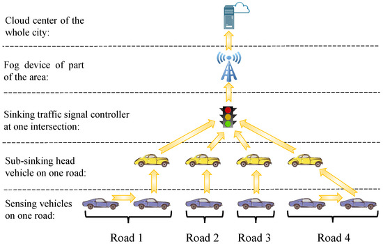 - Step 1. Based on the V2V technique, all non-head vehicles as sensor nodes send their route plans to the vehicles in front of them until all route information is gathered into the head vehicles (sub-sink nodes) on each road;