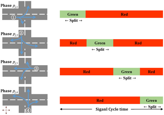 In Figure 3, the west flow entrance () is assigned a green signal and other three entrances are assigned a red signal in (). In phase (), the north flow entrance () is assigned a green signal and other three entrances are assigned a red signal. In phase (), the east flow entrance () is assigned a green signal and other three entrances are assigned a red signal. In phase (), the south flow entrance () is assigned a green signal and other three entrances are assigned a red signal.