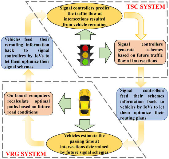 Traffic congestion has caused huge unnecessary consumption of urban resources. In real traffic, there exists a two-way feedback regulation between TSC and VRG. As shown in Figure 4, the reconfigurations of vehicle paths could change future distribution of traffic flow. Reversely, different signal control schemes can also determine how long it takes the vehicles to pass through intersections.