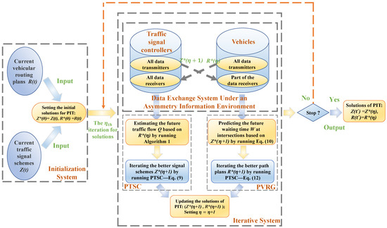 In a whole intelligent transport system, the distribution of traffic flow is the common results of multi-dimension working together. In this section, we integrate the proposed PTSC and PVRG to formulate a global optimal model—PIT by introducing two medium variables and . Inspired by game theory, we design an asymmetric information exchange framework-based updating distributed algorithm to solve the PIT model.