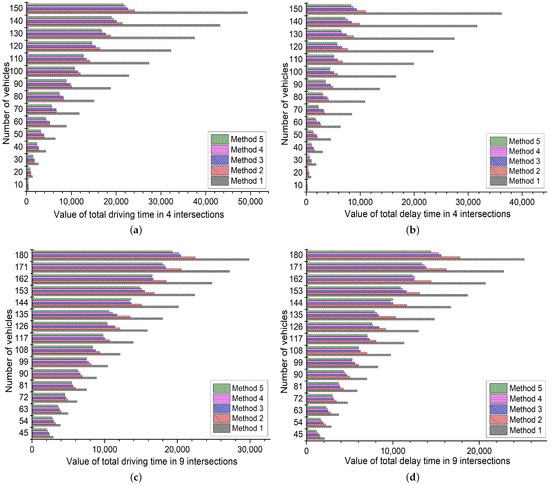 - In Figure 6a,b, for the robustness of the non-predictive dynamic TSC model, method 2 still performs better than method 1 with the increased vehicle number in Scenario 1. The average improvement efficiency is 47.85% and 65.81% in driving time and delay time, respectively. For the robustness of PVRG, all experiments in method 3 perform better than method 2 due to the working of predictive rerouting. The average improvement efficiency is 4.69% and 11.82% in driving time and delay time, respectively. For the robustness of PTSC, all experiments in method 4 achieve better results than method 3 due to the prediction of future traffic flow in TSC. The average improvement efficiency is 6.63% and 15.21% in driving time and delay time, respectively. For the robustness of PIT, the overall performance of method 5 remains better than the isolated improvements in PTSC and PVRG due to the function of our coordinated mechanism. Compared with method 4, 73.33% of the experiments obtain better results. The average improvement efficiency is 1.18% and 2.70% in driving time and delay time, respectively.