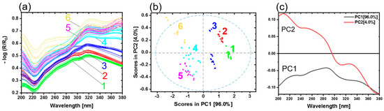 All samples were analyzed by a UV hyperspectral imaging prototype, as described in Materials and Methods. In order to make the data more comparable to the UV spectroscopy, the average spectra were calculated to reduce the number of spectra. A total of 25 spectra was determined from the hyperspectral imaging data for each of the 28 samples. Figure 5a shows the results of the UV hyperspectral imaging in the range from 200 to 380 nm.